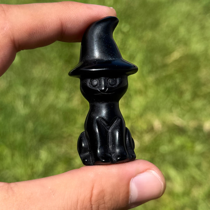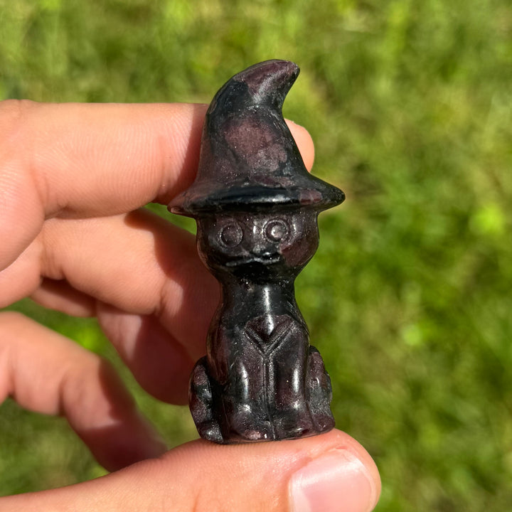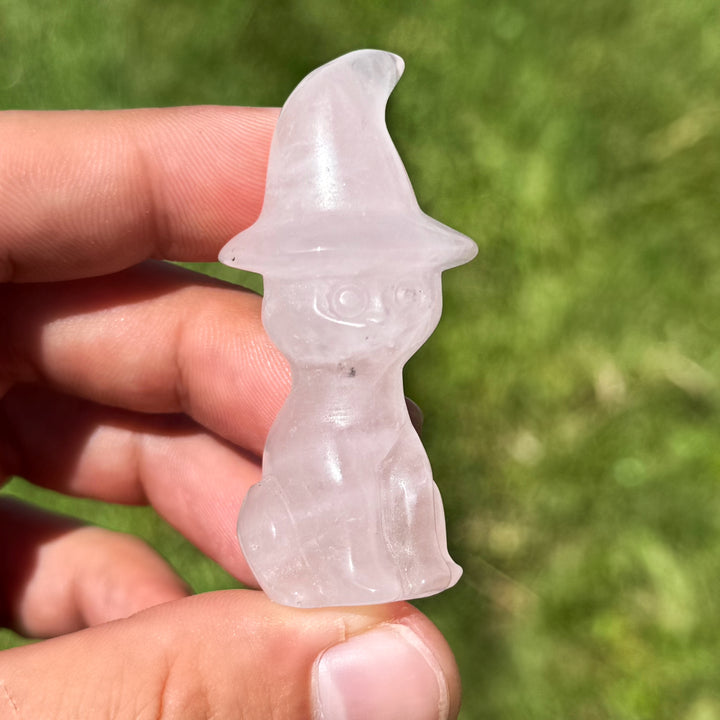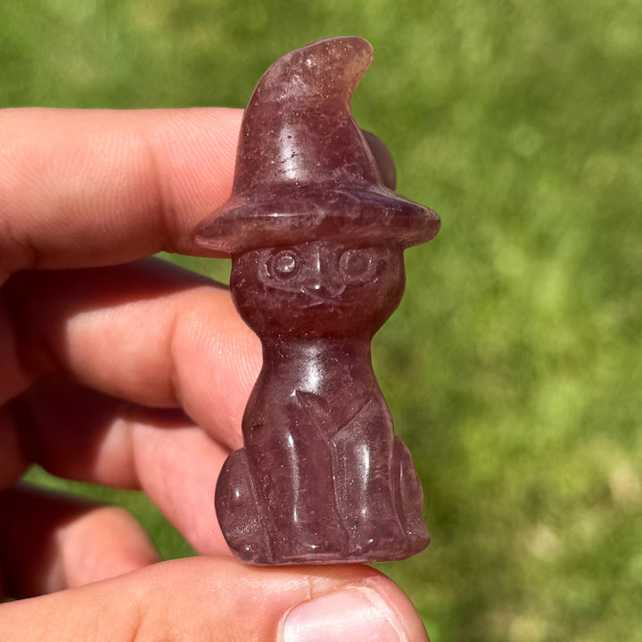 Cats wearing witch hats symbolize intuition, mystery, and magical wisdom. The cat represents independence and a guardian of spiritual secrets, while the hat connects to witchcraft and the harnessing of hidden power. Together, they embody protection, transformation, and the blending of the mystical with the everyday. Options include Rose Quartz, Strawberry Quartz, or Black Obsidian. One carving per order. LIMITED QUANTITY!