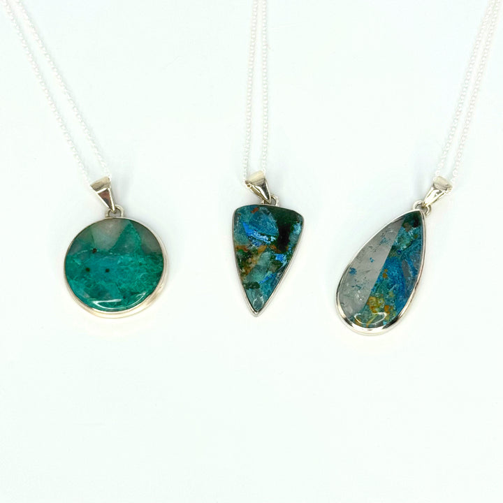 The Quantum Quattro crystal is a powerful healing stone composed of a unique combination of malachite, chrysocolla, smoky quartz, shattuckite, and dioptase—all working in harmony to support emotional cleansing, communication, and deep energetic healing. This beautiful pendant is paired with a high-quality sterling silver clasp and chain, offering both durability and elegance. The chain is adjustable to 18, 19, or 20 inches, making it easy to wear your healing energy at the perfect length for any style. Each pendant is completely unique in shape and color and intuitively chosen. One pendant and chain per order.